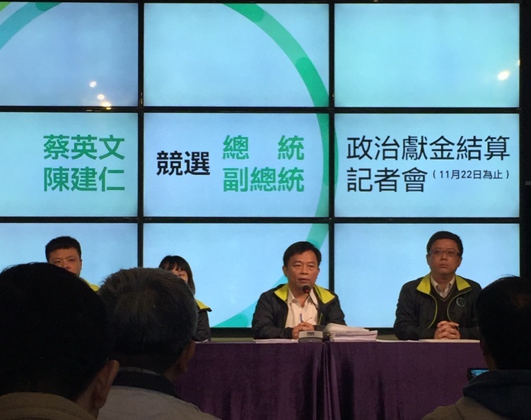 蔡英文競選總部表示,從5月26日到11月22日為止,一共募得4億元的政治獻金,支出1.95億元。在收入部分有7成的捐款來自於個人,一共有2.83億元;第二大來源是企業捐贈的近9千萬,其餘為人民團體及匿名等捐贈。在1.9億元的支出當中,最大筆是6千多萬元的宣傳支出,再來是4千7百萬元的集會指出。