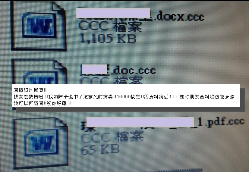 金姓工程師指出,常見的中毒現象是原來「.doc」的word檔,檔名變「doc.ccc」而「.jpg」的圖片檔,檔名變「jpg.ccc」,使用者把「ccc」去掉,發現檔案仍然打不開,那就是中毒了。「遭到感染的檔案被以RSA2048加密技術封閉,除非有密碼,否則你的檔案永遠解不開。」如果不想付錢,只好刪了它。
