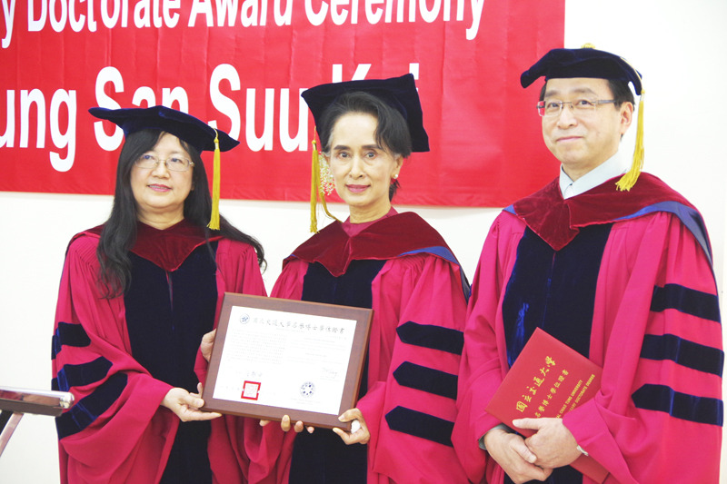 【台灣醒報記者鄭羿菲台北報導】剛領導「全國民主聯盟」在11月獲得大選勝利的緬甸民權運動領袖翁山蘇姬,12日獲交通大學頒發名譽博士,多位校長肯定翁山蘇姬的貢獻。交通大學校長張懋中13日表示,「希望交大人能效法她堅持理想,為人民福祉而努力的精神。」翁山蘇姬則說,「很高興交大頒授給我法學博士,我相信只有法治才能為國家帶來和平。」