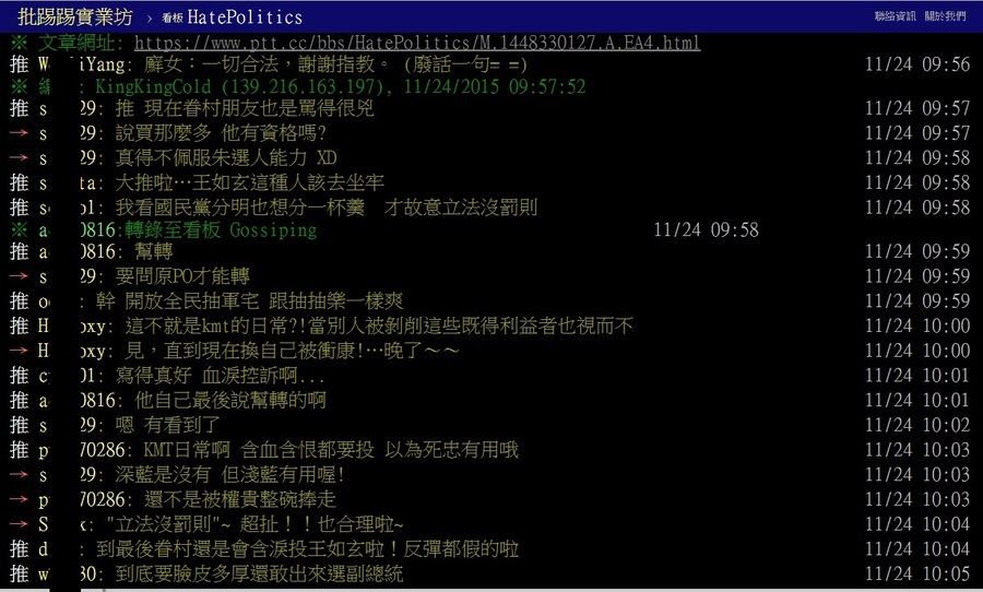 一位陳姓資訊工程師說,「在PTT上遇到『XD』這符號怎麼分析?有些還出現『XXXD』。」他再以在政治討論鄉民常用「崩潰」來形容藍營支持者,有時候用「崩」,有時候用「潰」,然後藍營支持者也開始用「崩潰」反唇相譏,他表示,還常見非正常語法,例如常見的「是不?」。還有特定符號如一講「香蕉」則暗諷邱毅的誤認太陽花為香蕉事件。
