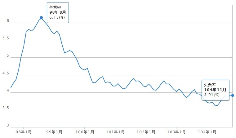 行政院主計處22日公布失業率顯示,11月失業人數為45萬7千人,失業率為3.91%,較上月微升0.01%,較上去年同期亦升0.02%;其中因工作場所業務緊縮或歇業與季節性或臨時性工作結束而失業者分別增加3千人與1千人,初次尋職失業者與因對原有工作不滿意而失業者則分別減少2千人與1千人。