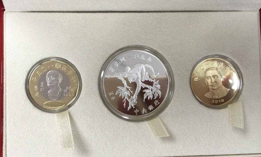 中央銀行7日發表最新猴年紀念套幣,內含純銀的猴面100元硬幣,及幾乎呈鏡面的50及20元硬幣各1枚。施遵驊表示,就像西遊記之中的美猴王孫悟空一樣,猴子屬於靈長類動物,身手矯健體態,與人類相似。因此猴年紀念套幣的正面圖案為「靈猴摘桃」。