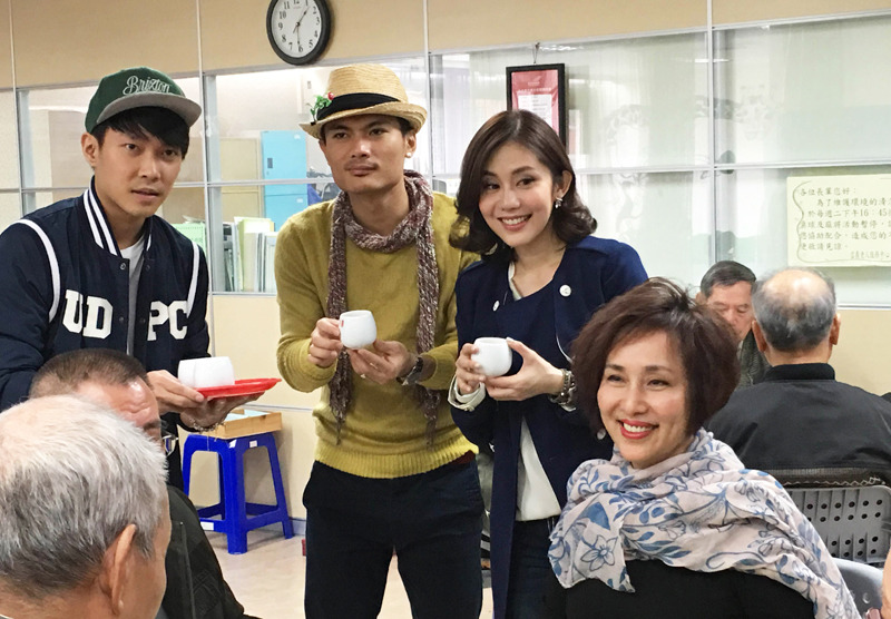 藝人許仁杰(左1)、郭耀仁(左2)及王宇婕(左3)端著熱騰騰的茶水「奉茶」給日照中心的爺爺們。(photo by 鄭羿菲/台灣醒報)