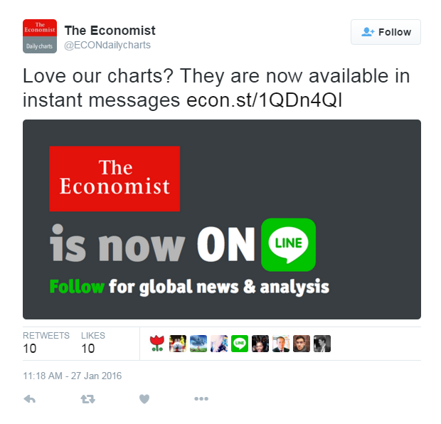 根據《Nieman》報導,《經濟學人》在微信(WeChat)上設立中英雙語《經濟學人全球商業評論》後的下一步棋,就是進軍日、台最瘋的Line。通訊軟體是未來的媒體趨勢所在,上前擁抱這個趨勢是各家傳媒的共識,但為什麼《經濟學人》挑中的是日本公司Line,而不是更普及全球的WhatsApp或臉書的Messenger?