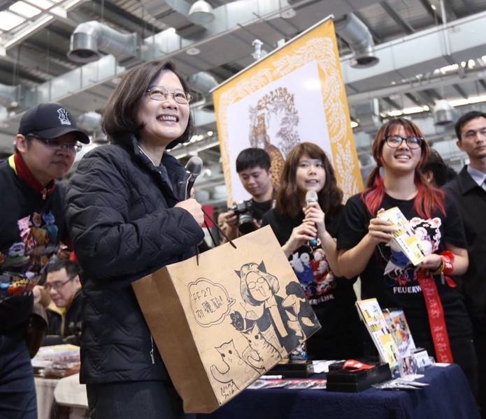 小英30日參觀動漫展受到動漫迷熱烈歡迎,不僅「霧島粉」對她狂喊「霧島」,漫畫家「蠢羊與奇怪生物」也特別送上以小英和兩隻愛貓為題材的《總統級貓奴》繪本,封面就是漫畫版小英飛奔似地衝回家大喊「想想、阿才!我終於選上總統了!好想你們…」卻被愛貓一掌堵住嘴,小英一回神才發現是「貓砂滿了」,活靈活現描繪這位「貓奴」總統的形象。