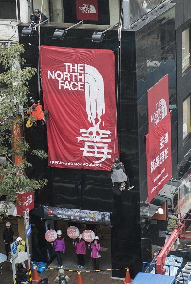 【台灣醒報記者黃捷台北報導】知名戶外服飾品牌The North Face台北公館旗艦店的大樓外牆,2日被綠色和平掛上5公尺長的惡搞布條,以大大的「毒」字諷刺The North Face的防水產品內含有害的全氟化合物。對此,The North Face台灣分部公關部回應表示,尊重綠色和平的抗議行動,並已向企業國際總部反映,總部也承諾將在2020年之前全面廢「氟」。