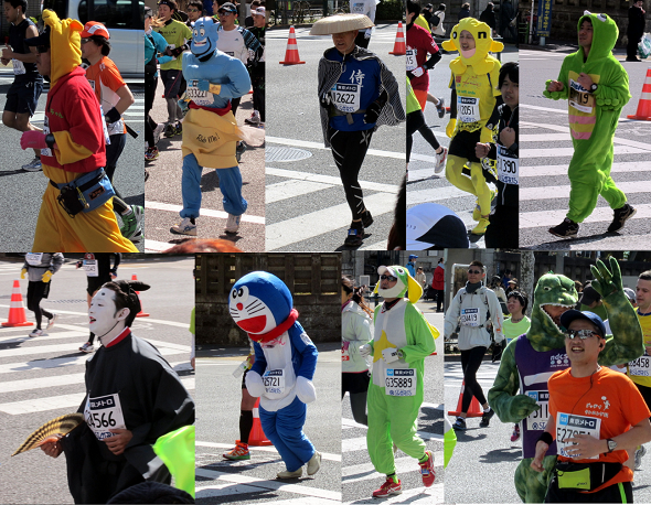 東京馬拉松猶如嘉年華會!日本的Cosplay文化盛行,搬上國際超馬賽事相當吸睛。歐陽靖提到,2014年參賽時還碰到有台灣選手身穿「三太子裝」以及「進擊的巨人」,還有星巴客裝、基督教先生則是著名常客,外國跑者也會扮裝上陣。