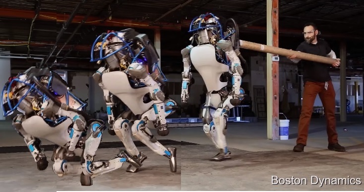「波士頓動力」24日將最新的ATLAS機器人戶外測試影片上傳YOUTUBE,影片中ATLAS能自己行走,雖在雪地裡幾次差點滑倒,但都能自我平衡,ATLAS在室內示範目視箱子,將它們整齊的放在架子上,測試員也刻意刁難它,若機器人從地上要舉起箱子,或者已握在手上,箱子就會被測試員推開或打下來,ATLAS會一直試圖撿起箱子並舉起來。