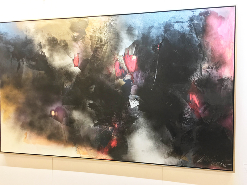 「以色列人出埃及時流浪並不像我們開車有GPS可以認路,當時上帝的雲柱、火柱就成了他們日夜的帶領方向。」與埔基有45年認識的林勤霖,29日在義賣展上指著作品向陳建仁介紹,油畫中抽象的藍紅色塊就代表了雲柱、火柱,