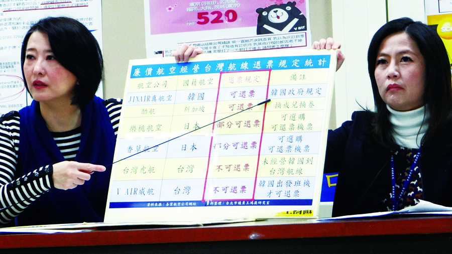 【台灣醒報實習記者林亭妤台北報導】雖然廉價航空的票價相對一般航空便宜許多,但廉航業者卻沒有合理的退票機制,以致票務問題在糾紛爭議中高居第一。台北市議員王鴻薇3日召開記者會,強烈要求廉航業者即刻改善對消費者的不友善條件。台北市政府主任消保官何修蘭亦指出,今年4、5月間會公佈各航空公司運送條款的查核結果,積極建立預防性檢核機制。
