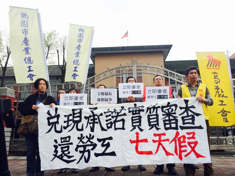 【台灣醒報記者黃捷台北報導】民進黨總統當選人蔡英文方在選前承諾,若取得國會主導權,將審查撤回勞動部刪7天假的行政命令,但至今本案仍未排入議程,因此多個勞工團體22日集結立法院前,要求社福衛環委員會的民進黨立委包括劉建國、鍾孔炤、林淑芬等立即兌現承諾。另外,時代力量立委洪慈庸也到場聲援。