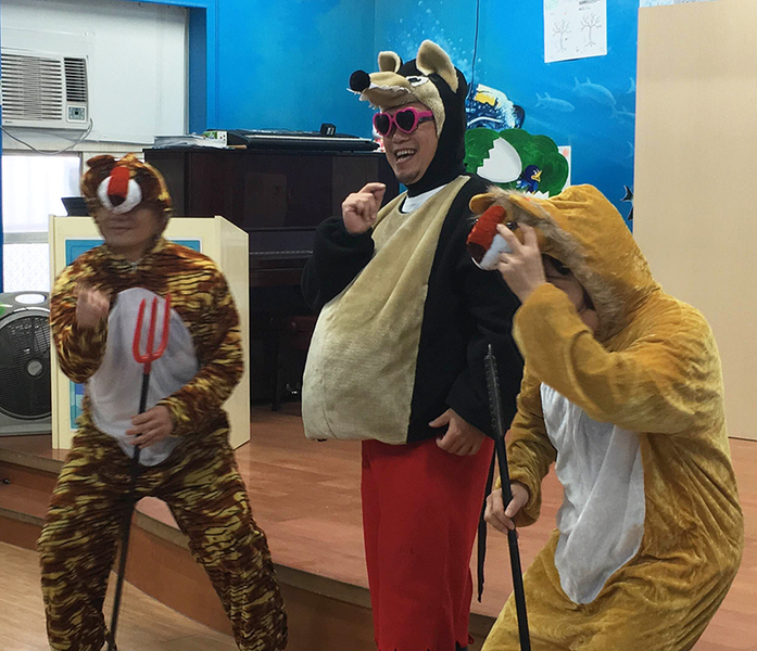 傻瓜團員們在演戲前細心檢討排練,飾演大野狼的張晉賢還叮嚀團員,「武器道具拿著就好,不要對著人揮舞,否則會給小朋友不好的示範。」開演後,團員們活潑唱跳,讓16位學童幾乎耐不住性子坐著看,頻頻想要一起上台演出。