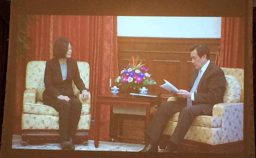 總統馬英九與準總統蔡英文30日進行雙英會談,雙方互動不多,但仍禮貌性握手致意。馬總統致詞時先是恭賀民進黨主席蔡英文高票當選,也強調她將是台灣第一任女總統,國內政治進程並將進行第三次政黨輪替。