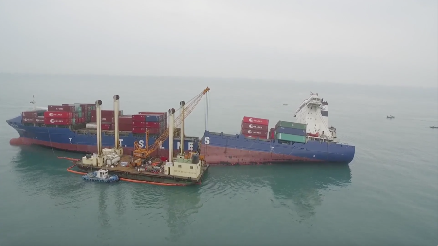 符樹強31日在行政院記者會上播放用空拍機所拍的現階段處理狀況影片,影片中,德祥貨櫃輪周圍的海水顏色與一般海水無異,且工作人員持續在抽取船內重油,而受到重油汙染的海岸線也已拉起白線,防止擴散造成二度污染。