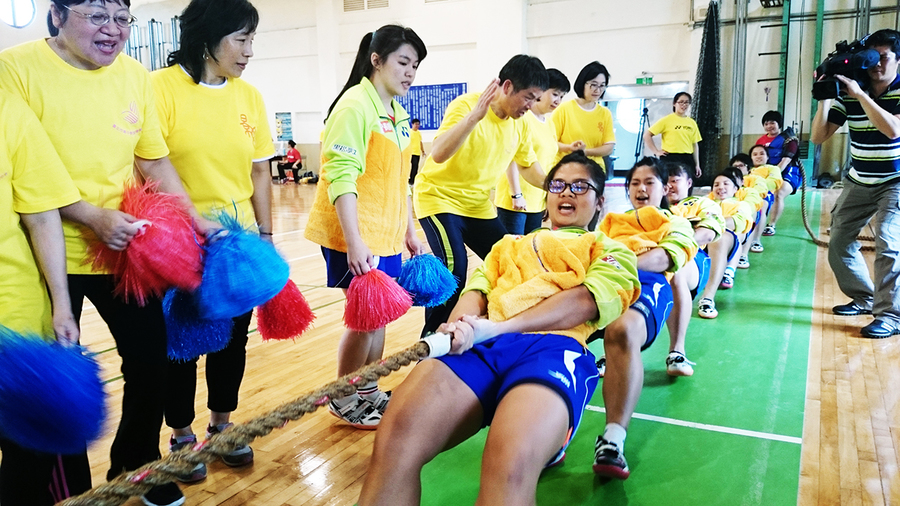 相較於一旁氣勢如虹的啦啦隊,場上8名拔河隊員們各個老神在在,神色從容,一副勝券在握的強大自信心。家長隊員紛紛不服,號召各路好手再度挑戰,募集近20人挑戰8名女中隊員。只見女中隊員們立刻展現絕佳默契並採用戰術,經歷一番抗衡後二度打敗對手,讓對手啞口無言,現場響起一片歡呼。
