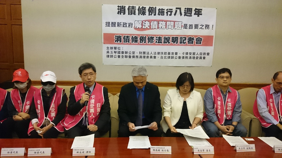 民進黨立委吳玉琴、卡債受害人自救會與法律扶助基金會11日召開《消費者債務清理條例》修法記者會。律師林永頌指出,我國《消費者債務清理條例》雖已上路8年,但仍有很多重大問題,像是現行的消債條例太過嚴苛,我國法院更生方案通過比率僅65%,相對於日本的85至92%明顯偏低;清算免責案件通過比率更只有45%,遠低於日本的97%。