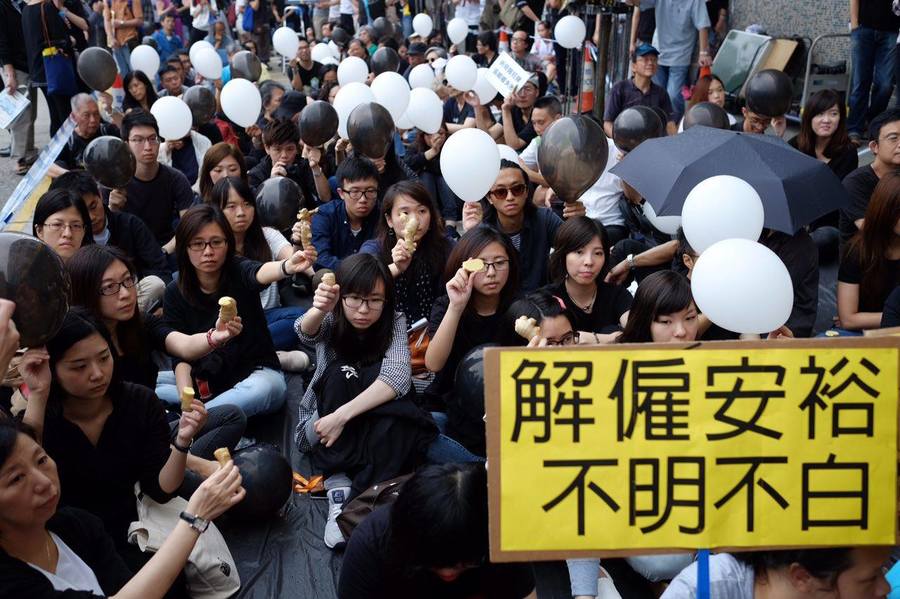 【台灣醒報特約記者陳玨明香港報導】香港新聞自由前景不明。為了《明報》上月漏夜解僱執行總編輯姜國元(筆名安裕)一事,八個香港新聞組織2日在明報工業中心門外發起「夠薑集會」,逾400人冒雨到場,除要求《明報》撤回解僱決定,並撤換總編輯鍾天祥外,也一同高舉生薑(薑跟姜廣東話同音),表示支持姜國元。