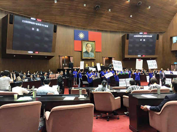 立法院院會9點一到,立法院長蘇嘉全走入國會,藍委們便齊聲高喊「綠色髮夾彎」、「林全下台」、「美豬有價,台灣無價。」等抗議標語,蘇嘉全多次清了清喉嚨表示,「請各位委員回座。」但效果不彰,藍委們還是持續霸佔主席台抗議,讓第一次被霸佔議會的蘇嘉全顯得手足無措,並在10多分鐘後宣布院會休息,進入朝野協商。