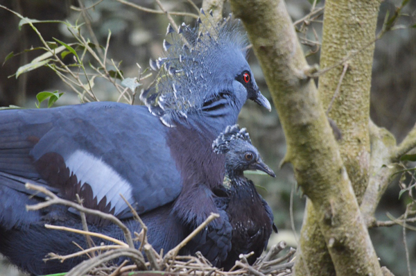 【台灣醒報記者鄭羿菲台北報導】頭頂著像孔雀開屏羽毛的維多利亞冠鴿再添新成員了!北市動物園發言人曹先紹13日受訪時表示,「維多利亞冠鴿的爸媽『威廉』與『凱特』今年總共產了3窩蛋,前兩窩沒有成功添子是因為雛鳥摔死及未受精。」保育員說,「最後一窩蛋是在5月9日孵化,現在雛鳥已不需要親鳥遮蓋羽毛保溫,但雛鳥還是會跟凱特窩在一起撒嬌。」
