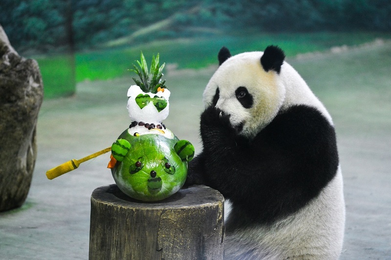 夏天出生的「圓仔」滿3歲,動物園保育員特別以夏季水果,幫圓仔製作