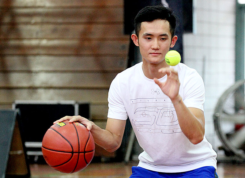 蔣淯安20日在台大體育館示範「不對襯運球模式」的高超球技。(photo by盧明正/台灣醒報)