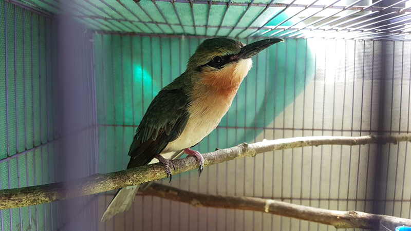 保育員說,栗喉蜂虎的外觀極美,且是夏季才到訪金門的夏候鳥,所以得到「夏日精靈」的美名,且滿月的栗喉蜂虎寶寶也已長出一身翠綠的羽毛,已由1天餵食6餐調整為1天3餐。他笑說,「為了不讓栗喉蜂虎寶寶太過親近人、失去對人的戒心,我們也自製了『鳥媽媽手套』,只要餵食就戴上手套,讓人工長大的牠仍保持戒心。」