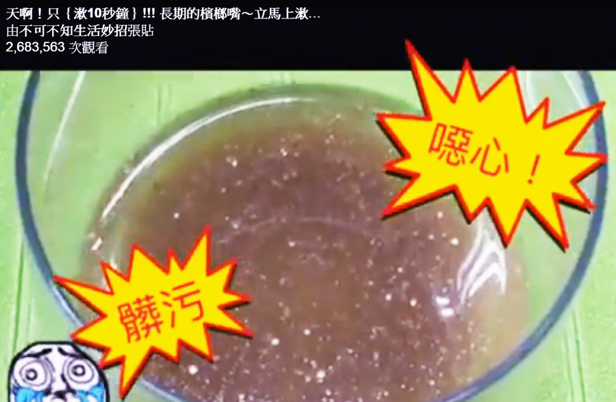 對於牙齒積累厚厚牙垢、想清除卻對看牙醫感到怯步的民眾而言,一款標榜「10秒鐘就把髒汙漱出來」的超神奇漱口水,似乎為他們打開了免於看牙醫的希望之窗。該廣告中的實驗指出,吐出來的漱口水裡看見的黑色沉澱物,即是陳年牙垢,許多網友紛紛在網購頁面下留言「趕緊買來除掉常年牙垢和菸垢!」、「當作父親節禮物送給阿爸!」
