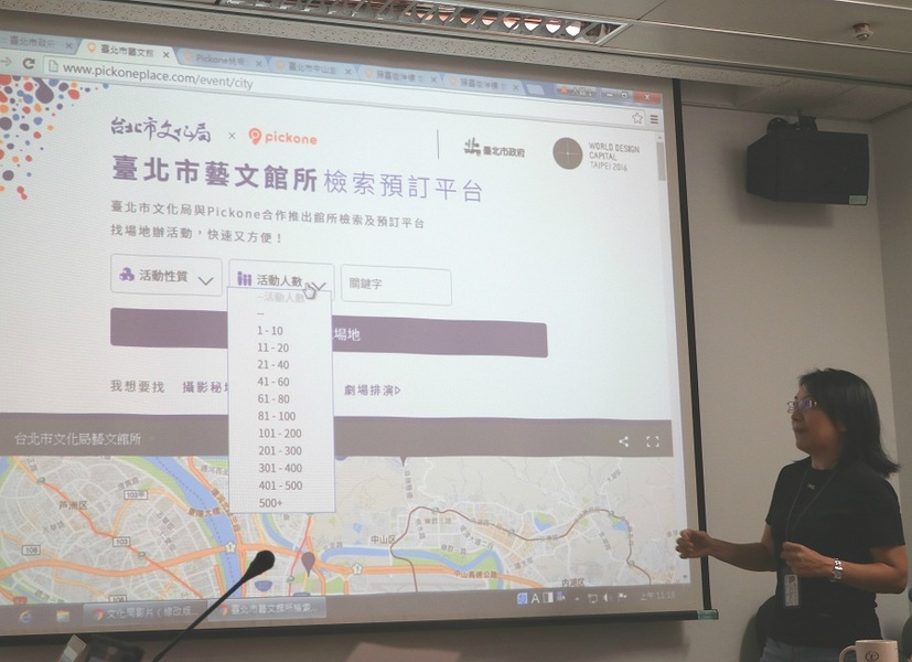 文化局局長謝佩霓表示,這次與網路平台業者「PICKONE」合作,整合轄下附屬機關及委外館加入此計畫,目前總共37個單位,平台24小時都能使用,只要勾選符合的需求:活動性質(會議、派對、表演…等)、活動地區、人數,系統就會自動媒合出客製化的結果,供民眾多元的選擇。