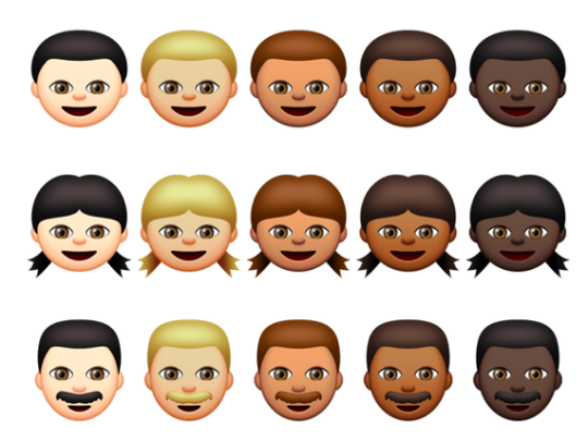 Emoji可不是英文,而是日文字「繪」(e)和「文字」(moji)的組合,2013年被權威的牛津英文字典增列為新字。2015年,蘋果iphone手機新增變換簡訊emoji膚色的功能,你可以選擇送出黃、白、褐、黑等四種膚色的表情和手勢,今年4月,Google的Android手機也跟進推出。未來,業者也將增加多元性別的圖示。