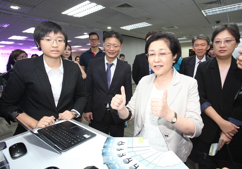 經濟部智慧局副局長鮑娟(中)22日在「2016台北國際發明暨技術交易展」展前記者會上,提前體驗隨戴隨用的「智能手語翻譯系統」。(photo by 盧明正/台灣醒報)