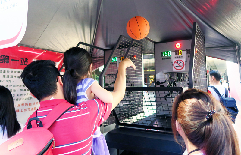 6道關卡包括簡易運動(投籃機)、於跑步機上慢跑1分鐘、疊疊樂、拼圖、量血壓等,有長者及小孩接觸到投籃機後愛不釋手,展現平常不可多見的身姿,籃球一顆接著一顆地進袋。