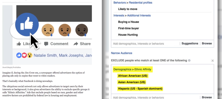 【台灣醒報實習記者李駿民綜合報導】社群網站Facebook(臉書)廣告服務容許客戶挑選廣告對象,最近鬧出種族歧視爭議,引來社會抨擊。專注於公眾利益調查的非營利媒體ProPublica於10月28日發表報告指出,Facebook容許客戶從廣告對象中剔除特定種族的用戶,已造成種族之間的差別待遇,或會干犯美國法律。