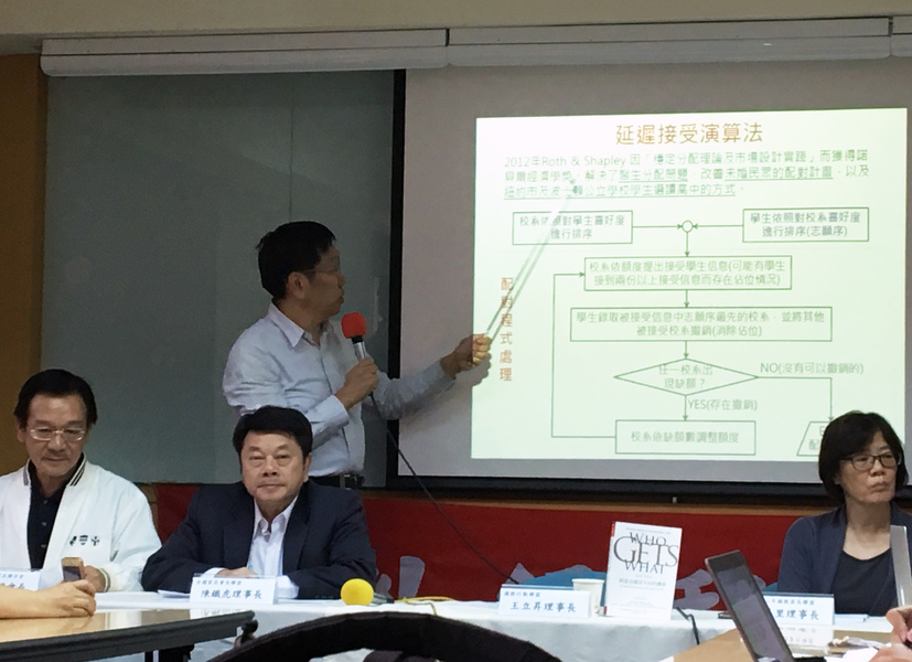 國教行動聯盟3日下午召開「以諾貝爾經濟學獎得獎理論解決大學入學制度的問題」記者會,全國十二年國教家長聯盟理事長、同時也是光明電子公司董事長的陳國祚設計出「延遲接受演算法」系統,可讓申請、繁星、指考等不同管道的考生同時配對選系,解決二階段分發讓學生、家長都焦慮不已的現象。