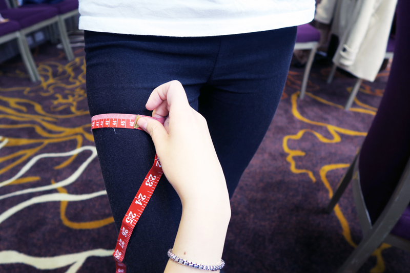 台灣流行病學學會現場示範頸圍、腰圍與腿圍的量測標準,測量頸圍應在男性喉結的位置,腰圍在肚臍上1公分、勿過度吸氣,腿圍則從膝蓋往上算起,到大腿根部前約2/3處。