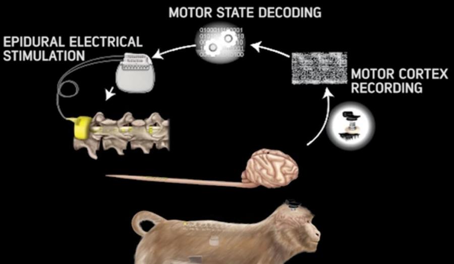 美國《有線電視新聞網》報導,實驗中將一套無線裝置植入於普通獼猴的大腦與脊椎下端,以代替脊椎的受損部分進行神經訊號的傳送。位於腦部的植入裝置,將大腦訊息無線傳送到電腦進行解碼,再通過無線訊號傳回脊椎下端的電極,讓其以電流刺激對應肌肉的神經。
