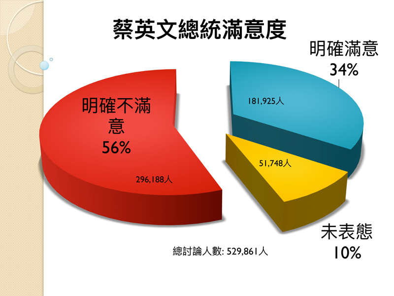 國民黨黨團委託「思為策略」搜集自8月24日到11月19日以來,臉書上討論英、全政府的話題數做民調,其中對蔡英文的討論中有56%不滿意,討論數有29.6萬筆、滿意僅餘34%,不滿意前5名的項目分別是外交兩岸、經濟民生、年金改革、食安把關與勞工照顧;討論行政院長林全的則有54.6萬筆,其中不滿意的有25%、滿意的有20%、未表態則高達55%。