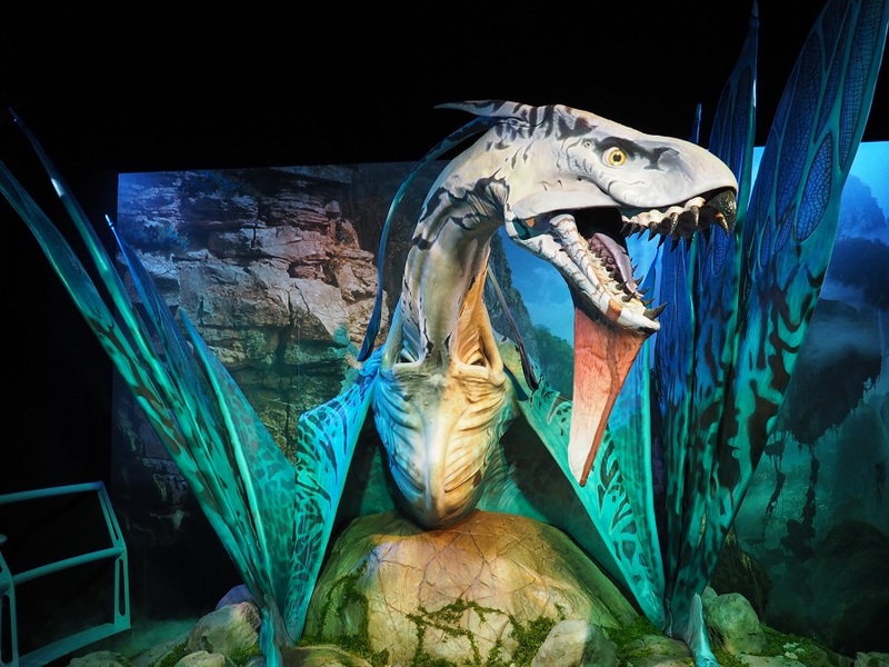 步入展區,潘朵拉星球映入眼簾,觀眾可以開啟自己的聽覺、觸覺、嗅覺去感受。包括嗅聞全世界最臭的花、觸碰就會縮起來的花、聆聽納美人獨有的樂器,製作團隊也以一比一的比例製作了9呎高的納美人一家,和星球上特殊動物如靈鳥、蟒狼,搭配詳細的解說,幫助觀眾對星球上的生物更了解。