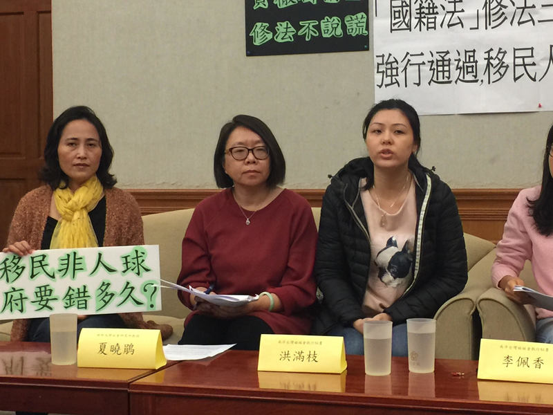 台灣移工聯盟12日召開記者會提出《國籍法》修法的爭議,第19條「取消撤銷國籍的制度」,歸化後的移民姊妹已放棄母國國籍,一旦經由法院判決「假結婚」或是「假收養」,政府將「終生」撤銷新移民國籍的權利。