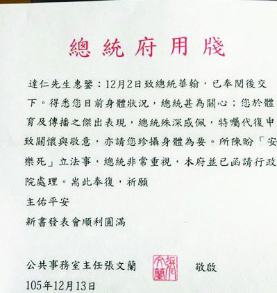 【台灣醒報記者章文台北報導】針對資深媒體人傅達仁上書總統蔡英文,陳請通過「安樂死」法案,總統府13日回函提醒傅達仁保重身體,也說總統非常重視安樂死議題,已經函請政院處理。傅達仁在臉書上高呼「感謝讚美主」,他並說,台灣應不分藍綠,倣效歐美先進國家配合長照成套,實行安樂死。