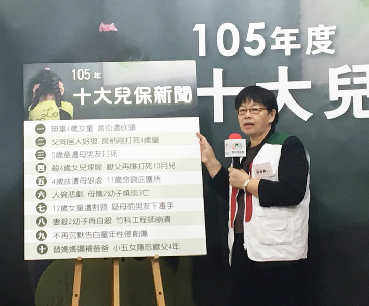家扶基金會公布105年度十大兒保新聞,最嚴重的頭條新聞就是震驚全台的內湖小燈泡命案「無辜4歲女童,當街遭砍頭」。社工人員與專家學者從156則案件、248則新聞中,根據重要性、影響性、教育性等三大原則,選出與兒童福利相關的年度重大新聞。其中,身體傷害致死的案件及新聞最多。