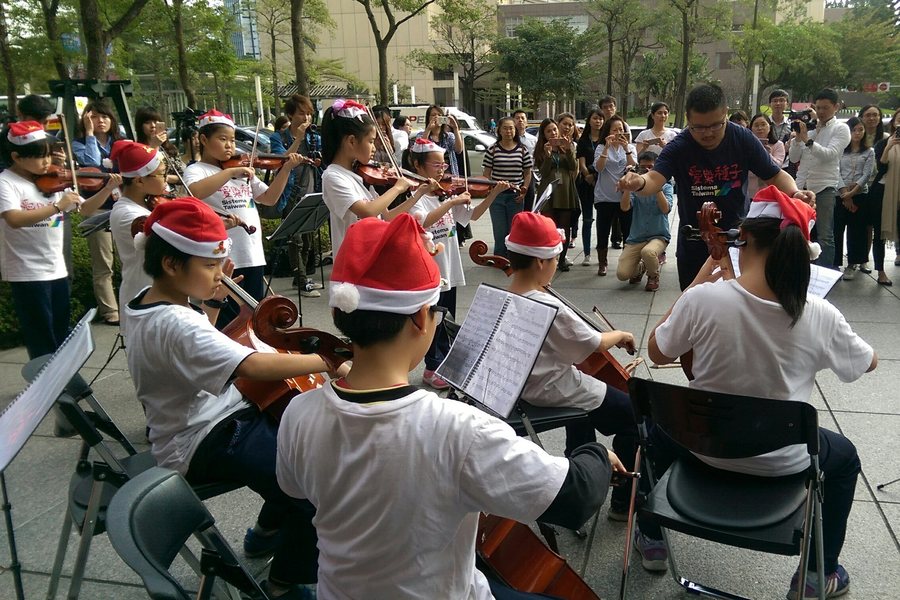 【台灣醒報實習記者林祉延台北報導】動聽的聖誕節組曲弦樂在松高路上悠揚響起。原來是來自「Sistema Taiwan愛樂種子」弦樂團的小朋友們的用心演奏。在經歷了8個月的辛苦練習後,「愛樂種子」弦樂團21日終於迎來了他們第一次的快閃表演,在這溫暖的聖誕節前夕,為大家帶來滿滿的聖誕祝福!
