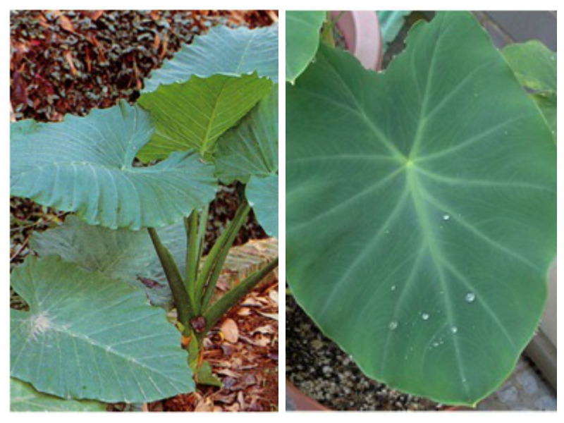 「區分姑婆芋與芋頭可從葉片與葉形大致辨別,」食藥署指出,芋頭的葉片是絨質的、水珠滴在葉面上,會形成一顆顆小水滴,姑婆芋的葉面則是革質的、水珠無法凝結;芋頭的葉形是盾形的、葉脈不明顯,姑婆芋的葉子則是廣卵形、基部呈心狀箭形。