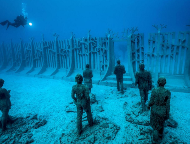 【台灣醒報記者林佳楠綜合報導】身穿潛水裝備參觀博物館?你沒看錯,歐洲首座海底博物館1月中於西班牙外海開幕,在海底15公尺可看到英國藝術家Jason deCaires Taylor所製作的300多座人身群像。這些雕像不但具有「人工珊瑚礁」的功能,其仿真的日常動作移置海底,更傳達出寂靜的神話感,引人思考藝術與自然之間的永恆辯證。