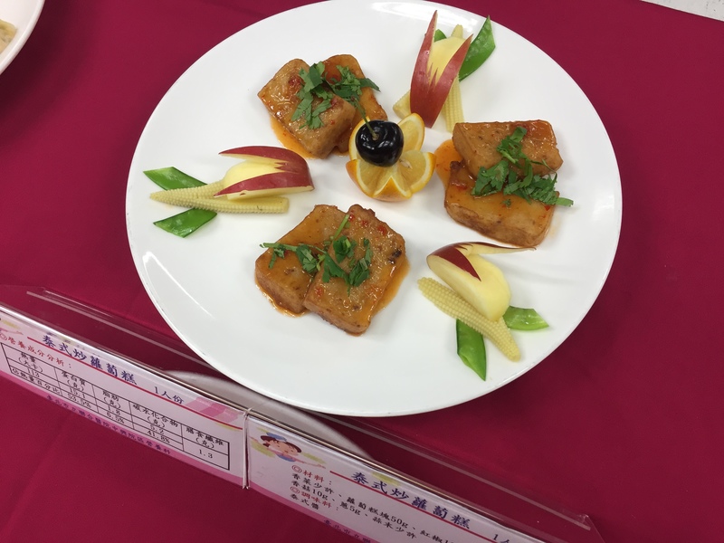 《泰式蘿蔔糕》的作法為,先將生香菇、蔥、蒜末放入油鍋內炒香,加入少許水及泰式醬,再放入切片後的紅椒拌炒,最後將蘿蔔糕擺入烹煮至湯汁稍收乾後起鍋,撒上香菜點綴即可。