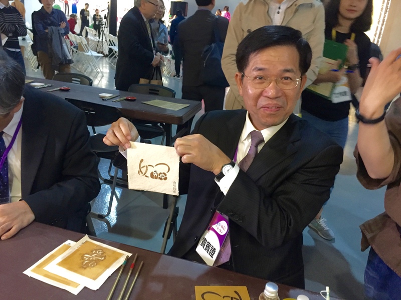 潘文忠在現場用不同顏色的染筆,畫染柿子圖樣的布,為展現最完美的染作,他著畫時投入描繪圖樣每一細節重複說著「這裡再補強、那裡再補強一下」,無心理會身旁工作人員提醒還有下一個活動流程,完成作品時也表示滿意,直稱老師教得好。