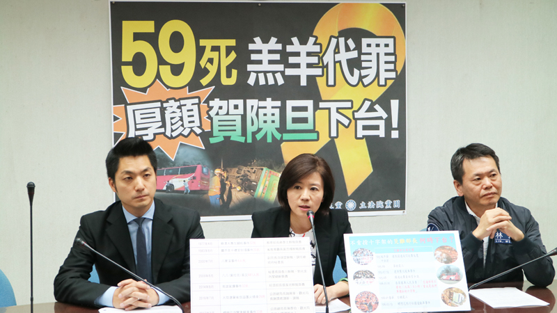 「賀陳旦任內兩起重大遊覽車事故,共造成59條人命死亡,嚴正要求賀陳旦負政治責任下台!」王育敏20日在「59死羔羊代罪,厚顏賀陳旦下台」記者會上表示,過去只要發生重大傷亡事故,政務官的風骨就是請辭負責,但賀陳旦自己不下台卻要兩局長當代罪羔羊,國民黨團絕對不能接受。