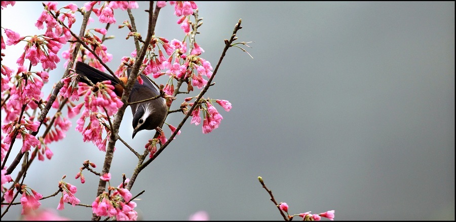 白耳畫眉算是櫻花叢裡的忠實常客,體型較大也比較不怕人。平常分布於中海拔山林,冬季或初春會降至數百公尺的低海拔山區避寒、覓食。