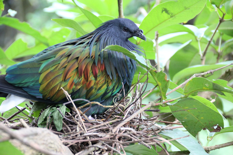 保育員說,2月的時候就發現鳥園區的兩對綠簑鴿在遊客步道旁的樹木上築起「愛巢」,不久後就發現其中一個鳥巢已有孵化的雛鳥,而另一窩的雛鳥則晚了約一週才孵化,已經1個月大的雛鳥目前還是以親鳥反芻的分泌物「鴿乳」為食,大概要2個月大才會離巢獨立生活,也在那時候開始轉吃種子、昆蟲等固體食物。