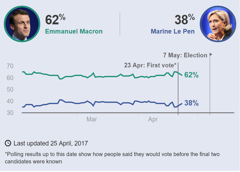 根據最新民調顯示,年僅39歲的馬克宏將以62%的高得票率,擊敗僅38%的勒龐,成為法國有史以來最年輕的總統。看來勒龐想要打敗馬克宏,還有好長的一段路要走。