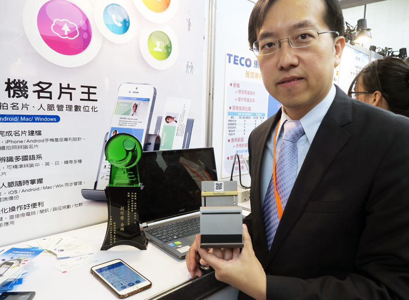 「百來張名片一把抓的你,將名片數位化了沒?」我國蒙恬科技公司於名片數位化領域上,在全球排行數一數二,其研發的「手機拍照放置裝置」獲頒創作獎金獎。蒙恬科技全球支援服務部資深處長郭維新說,現在市面上已經有免費幫名片建檔的APP可以下載,推出此裝置是針對擁有更大量名片交流的商務人士。
